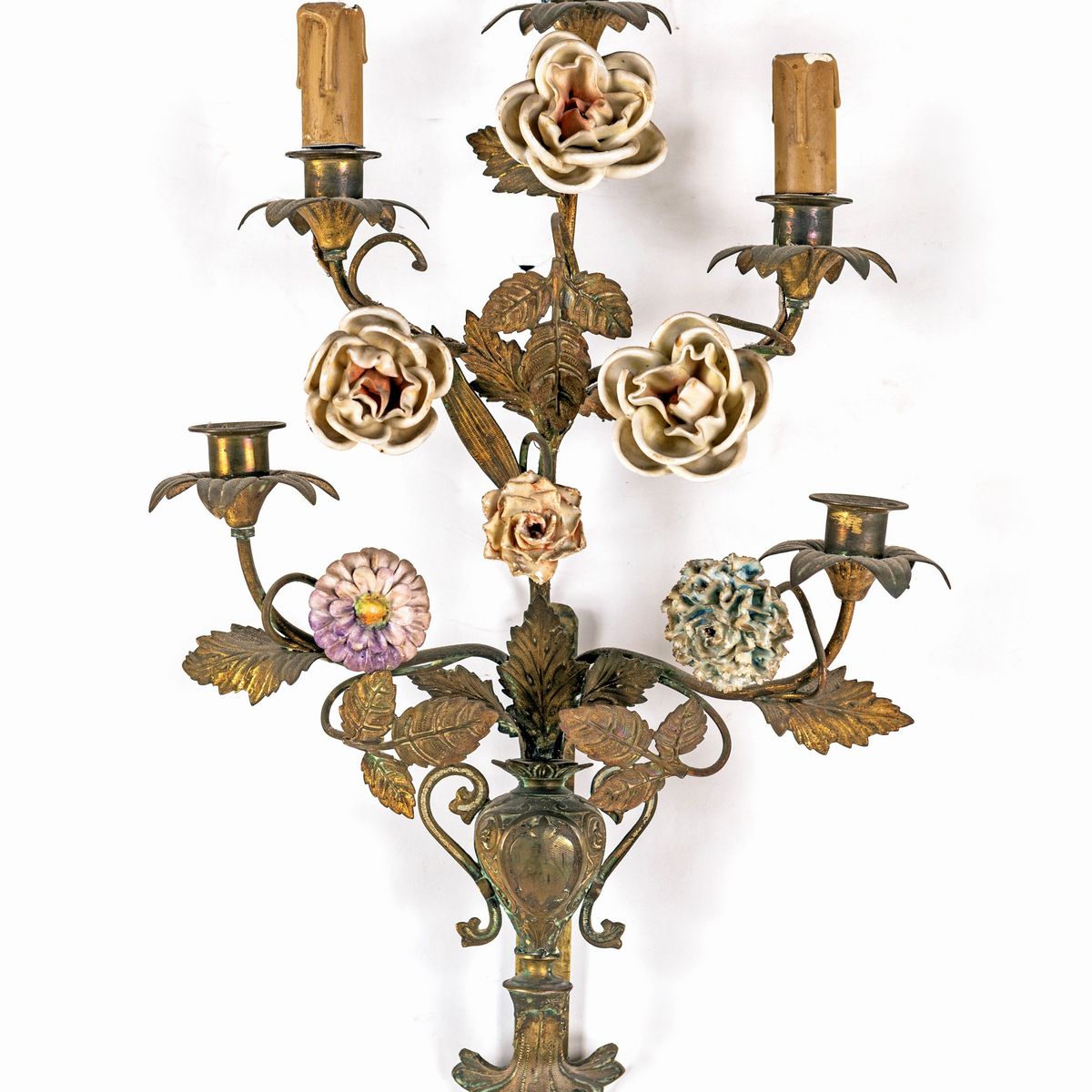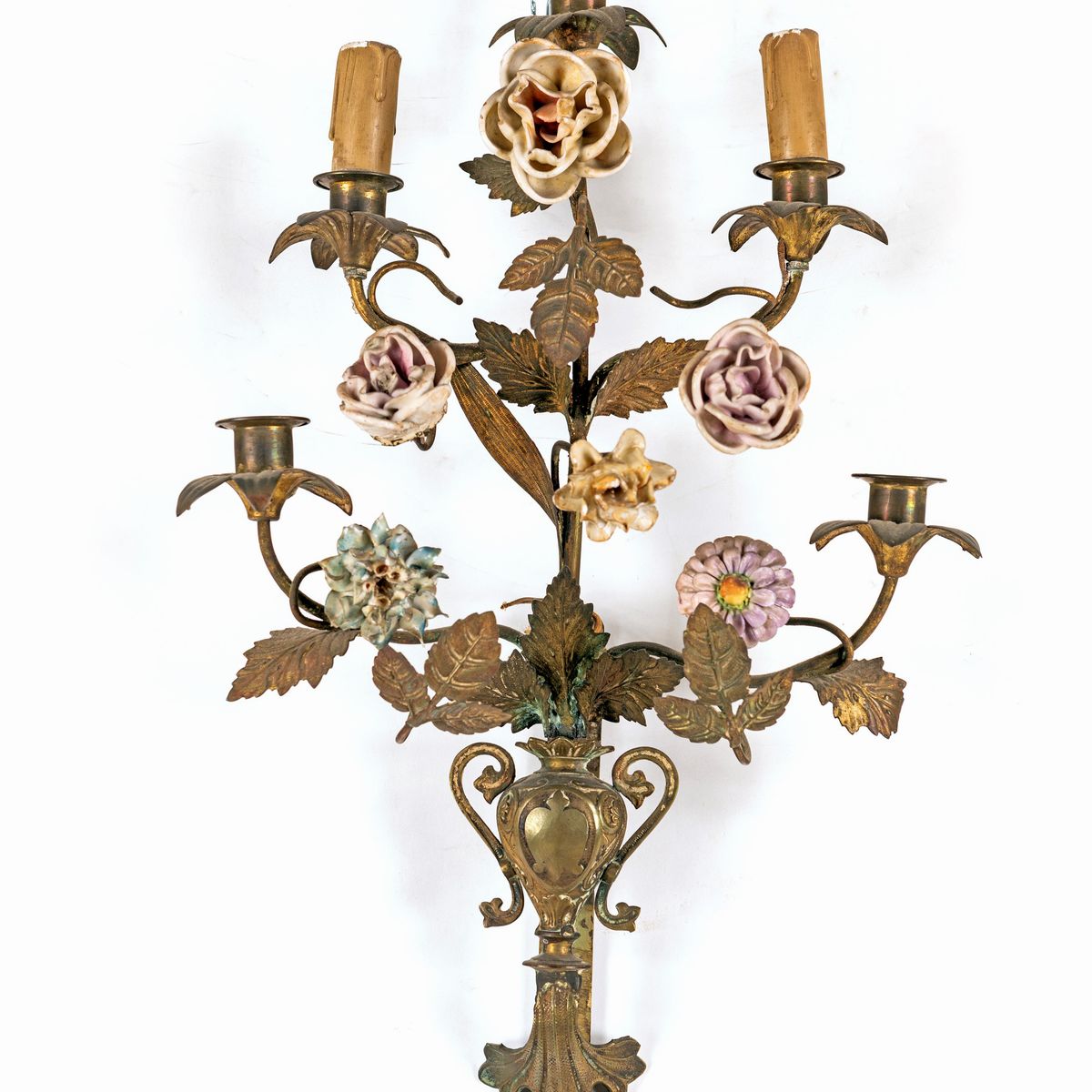 Coppia di appliques in metallo dorato e porcellana a cinque luci, fine del XIX secolo