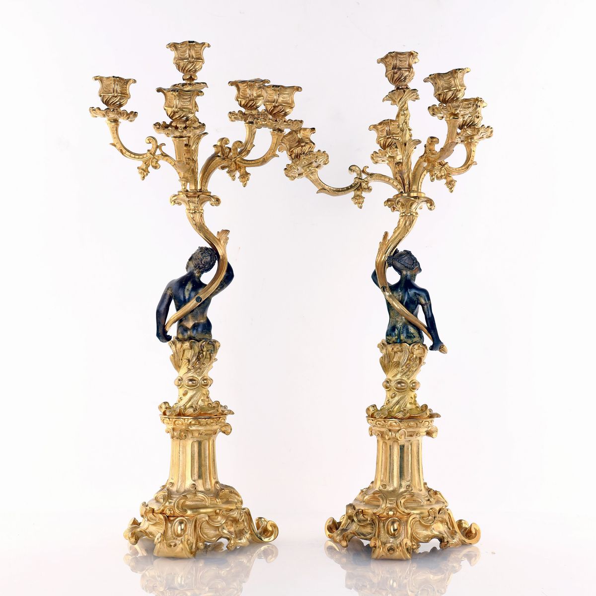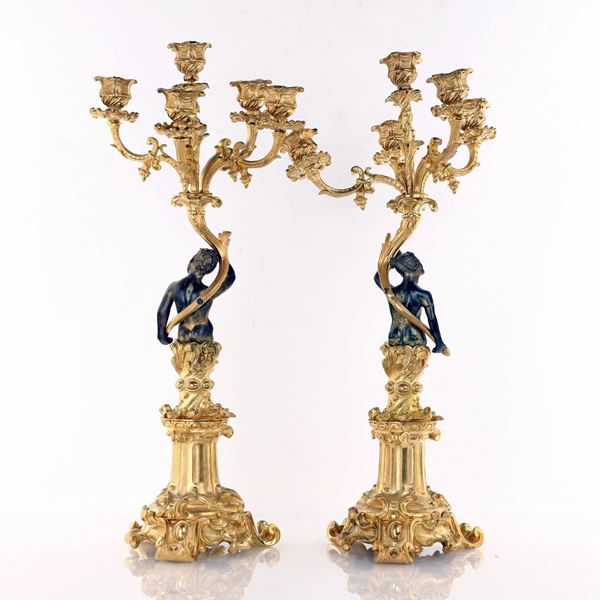 Coppia di candelabri in bronzo dorato a cinque luci, XIX secolo