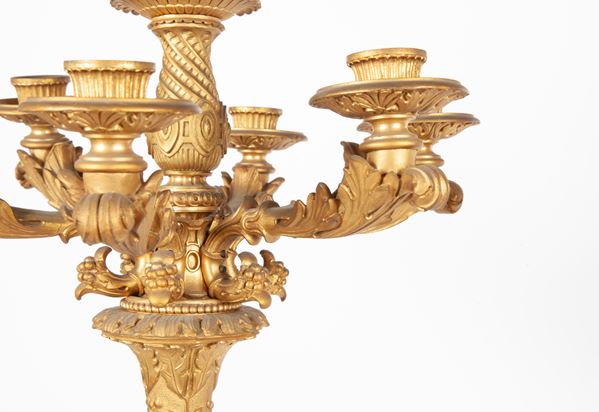 Coppia di candelabri in metallo dorato a sette luci, XIX secolo