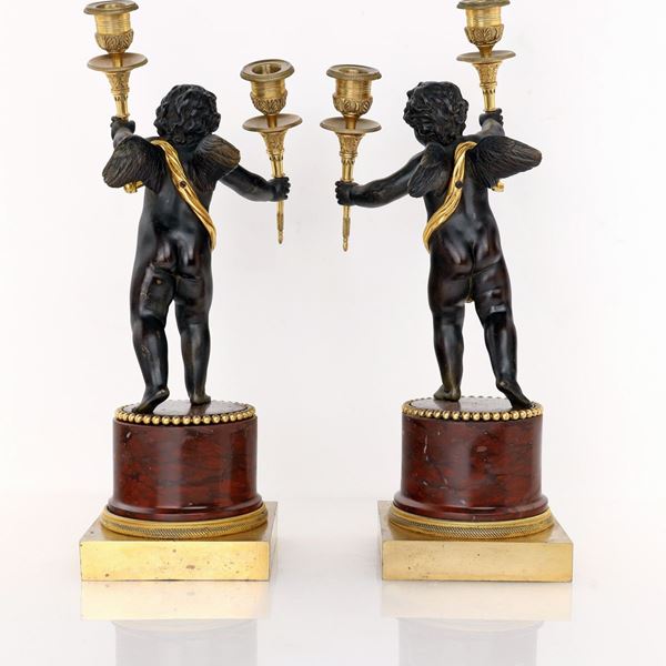 con reggicandela sorrette da figure di amorino stante su piedistallo a rocchio di colonna in marmo rosso