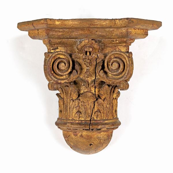 Coppia di mensole in legno intagliato e dorato a forma di capitello, XIX secolo