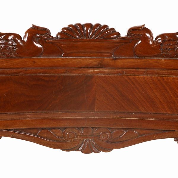schienale a giorno con spalliera in forma di cartella circondata da motivi vegetali; braccioli terminanti a ricciolo, sedile imbottito, gambe anteriori rastremate, posteriori a sciabola