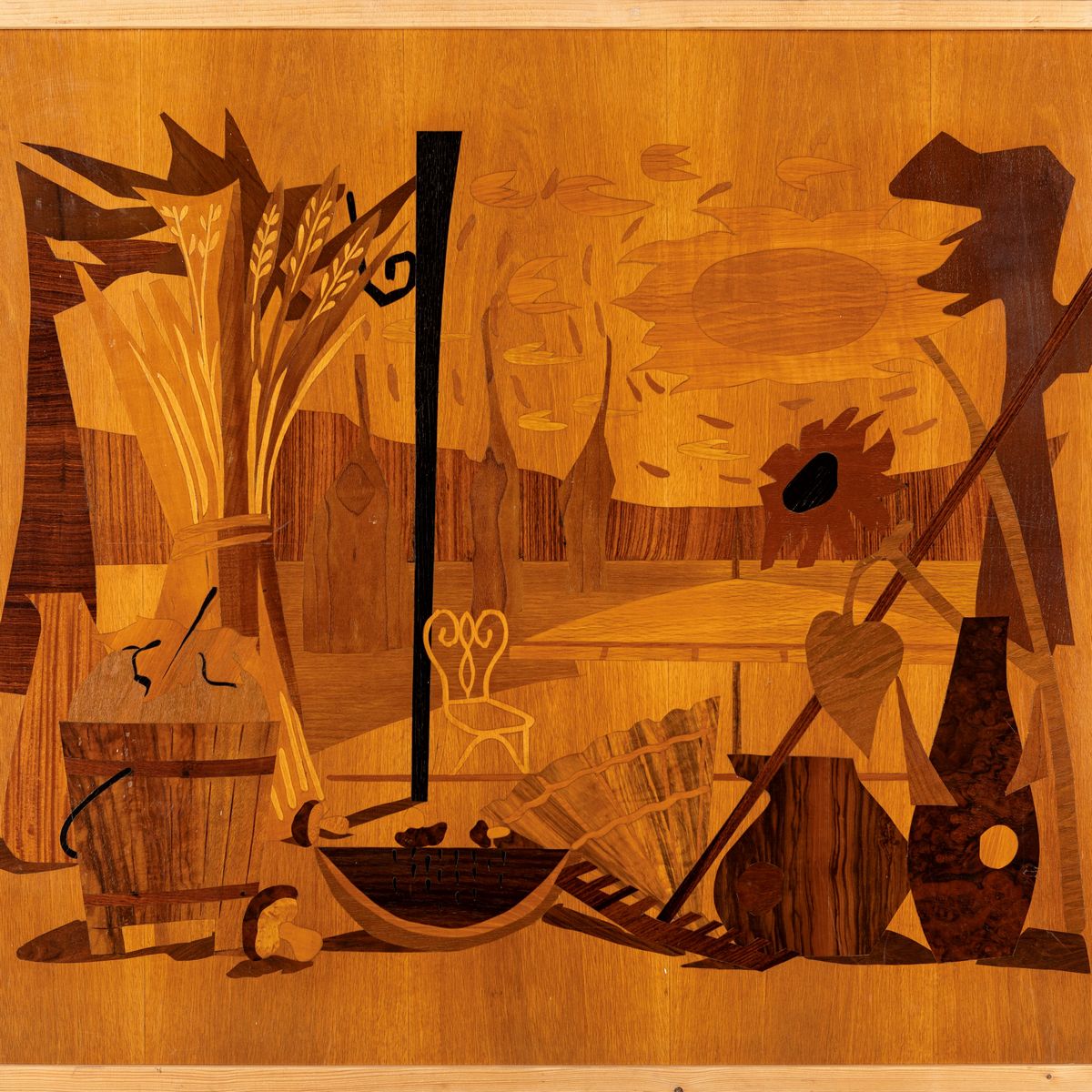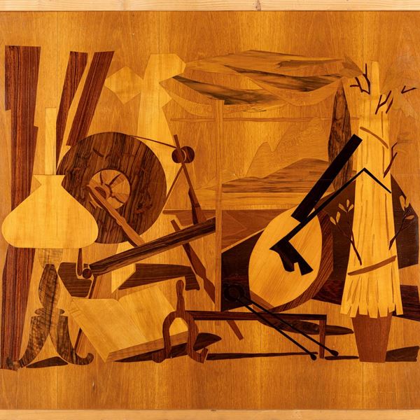 raffiguranti una natura morta con arcolaio e mandolino e una natura morta con mazzo di spighe, fetta di anguria e funghi