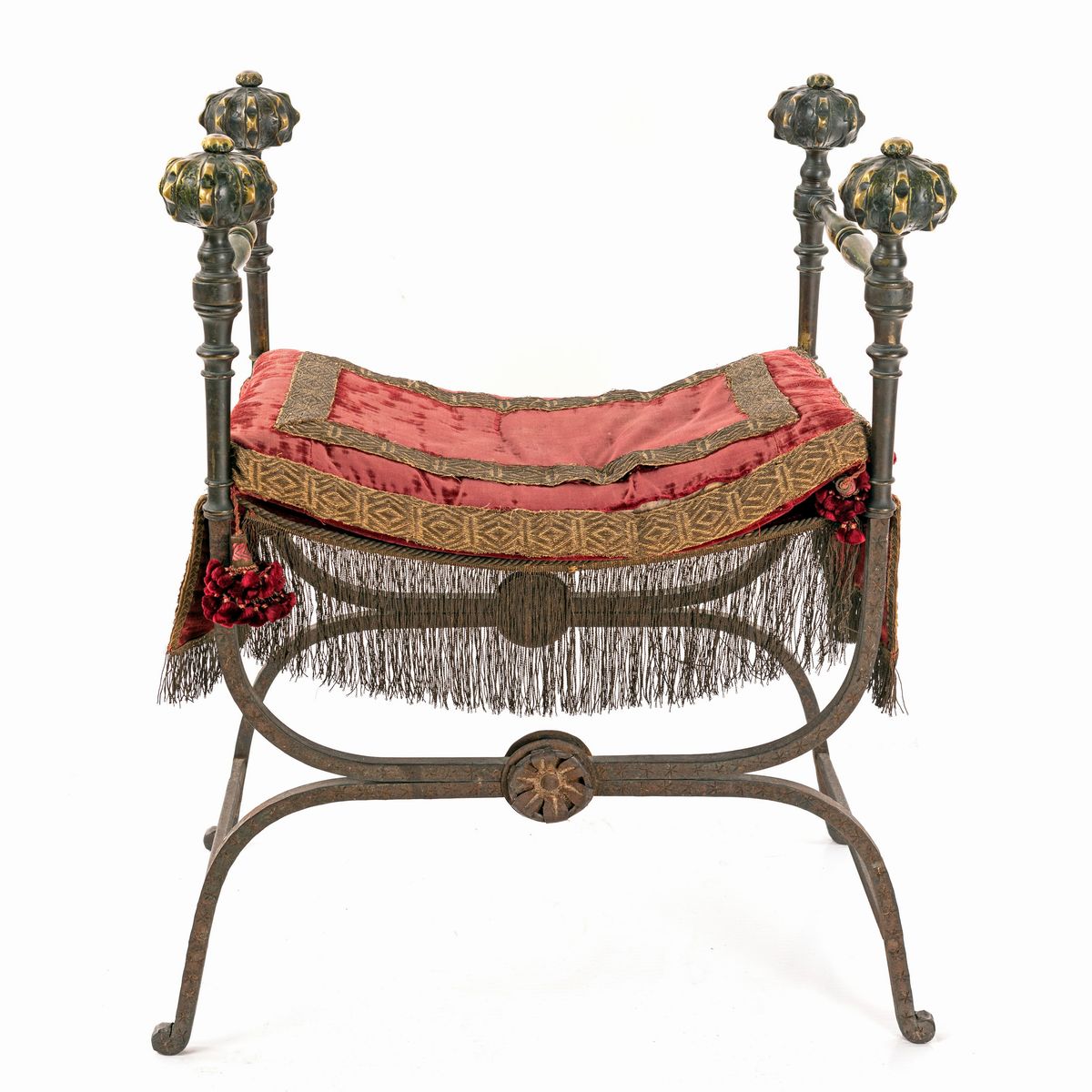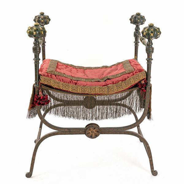 caratterizzato da pomoli baccellati in bronzo dorato somiglianti a melagrane; sedile sormontato da cuscino rosso porpora con gallonatura dorata, struttura incrociata pieghevole