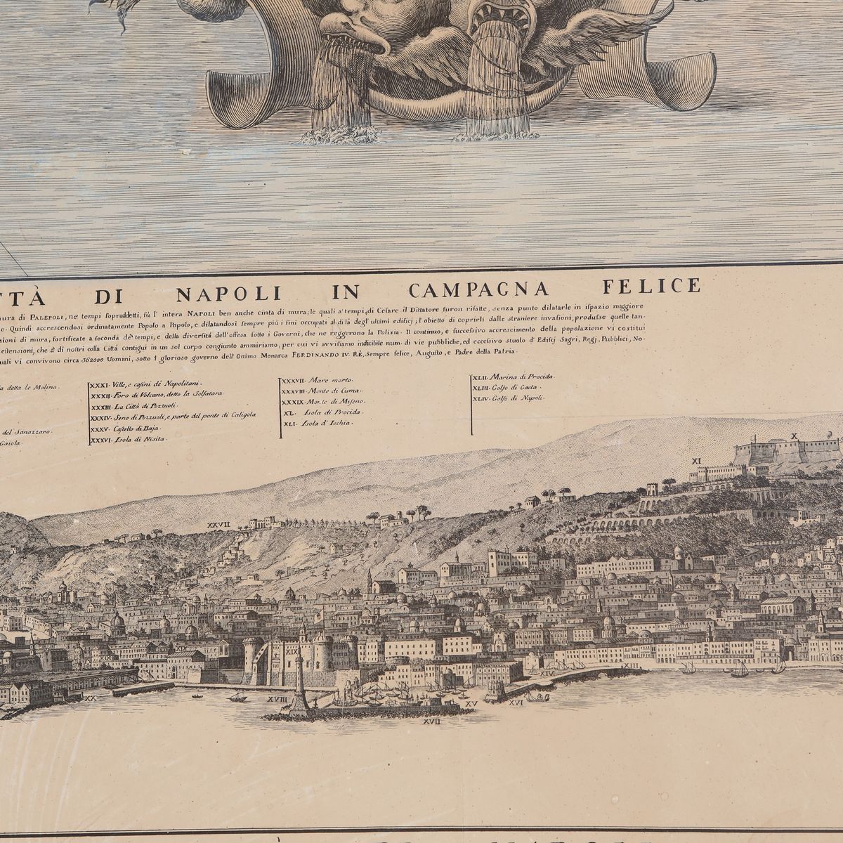 A margine: Veduta scenografica a ponente della citta di Napoli in campagna felice; spiegazione storiografa dell'antico e del moderno della citta di Napoli, legenda composta da 580 richiami con notizie storico-artistiche.