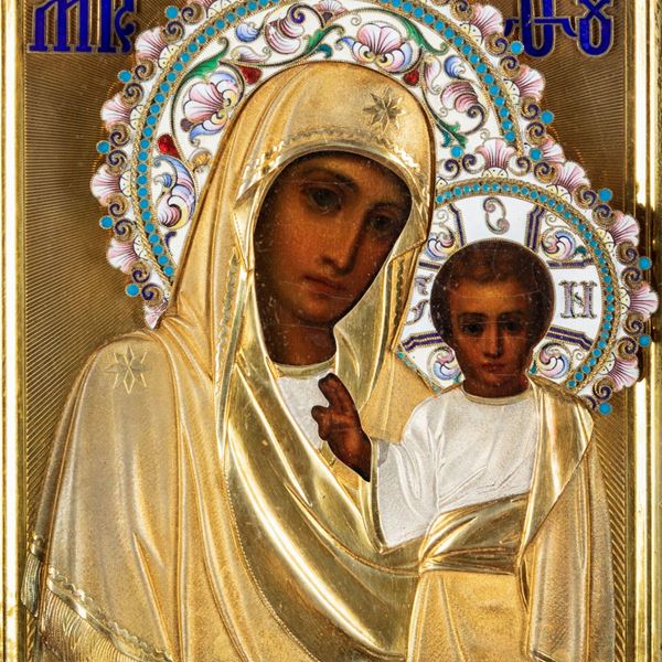 Icona con ritza in argento dorato e smalti, Russia, prima metà del XX secolo