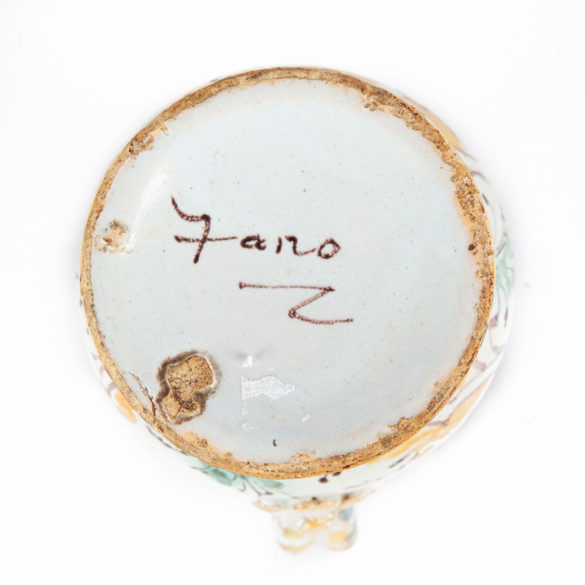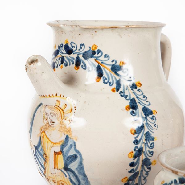 una coppia di brocchette con versatoio cilindrico ed un piccolo albarello decorati in giallo, verde e blu, caratterizzati da figure di Santa Martire, ed una brocchetta con orlo superiore trilobato decorata da un paesaggio con case. Rotture e mancanze