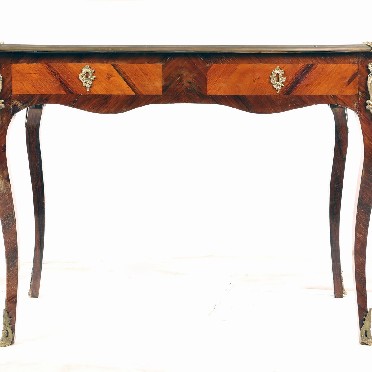 con finiture ornamentali in bronzo dorato; piano rettangolare sagomato, due cassetti in linea nella fascia, gambe sagomate
