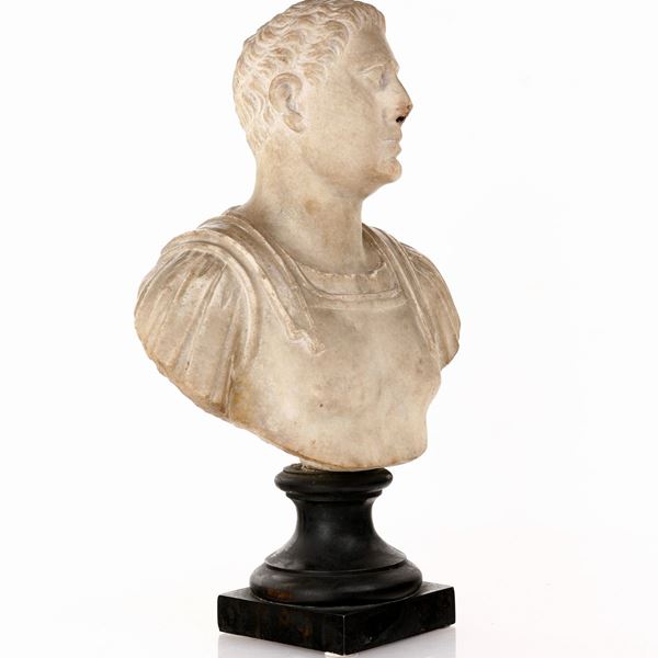 raffigurante un Imperatore romano; piedistallo a rocchetto su base quadrangolare in marmo nero. Piccola mancanza al naso
