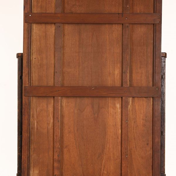 con facciata suddivisa in tre cassetti privi di traverse, spigoli scantonati, piedi a mensola; la specchiera è caratterizzata da dieci motivi decorativi incisi simmetricamente disposti lungo il perimetro