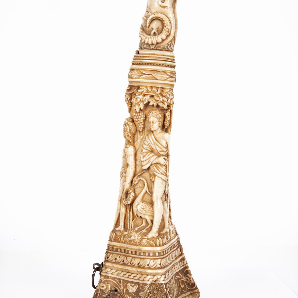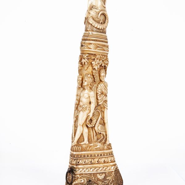 decorato in bassorilievo a tutto tondo da un corteo con fauno e baccanti su sfondo di paesaggio con amorino e figure di volatile; la scena è racchiusa da più ordini di cornici con elementi naturalistici alternate a motivi geometrici; vertice caratterizzato da testa di ariete; sul fondo B.D.V. 1512