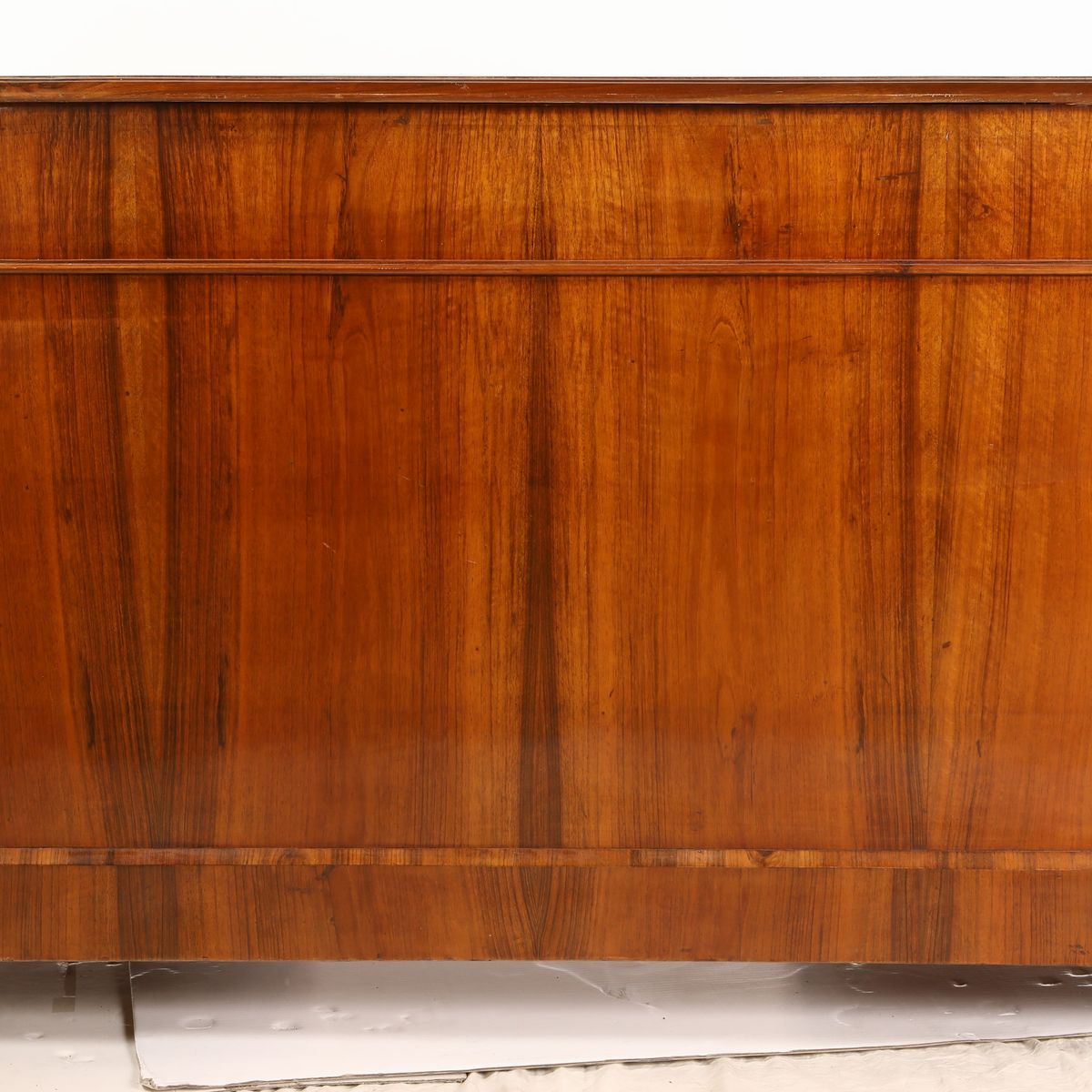 piano rettangolare ad angoli arrotondati privo del rivestimento in pelle, un cassetto nella fascia affiancato da quattro tiretti in colonna disposti ai lati, con riquadri incorniciati e maniglie in bronzo; piedi a trottola