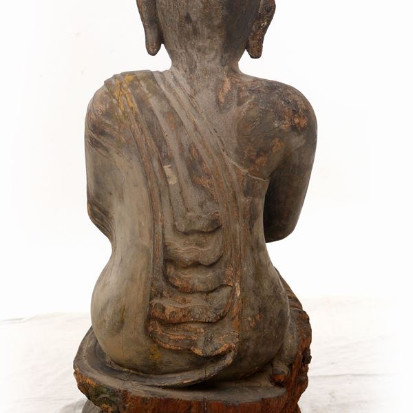 raffigurante un monaco inginocchiato su un doppio fiore di loto, la mano destra posata sul palmo della sinistra