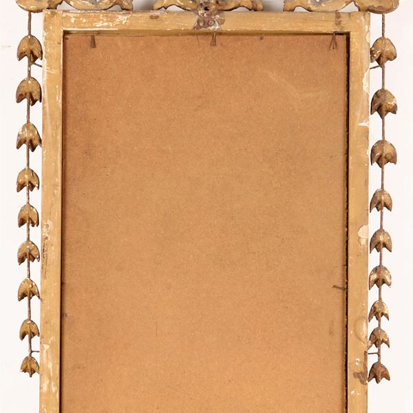 cornice rettangolare a due ordini di intaglio, sormontata da un medaglione con corolla sormontata da un giglio, affiancata da volute vegetali da cui si dipartono cascatelle di campanule; profilo inferiore centrato da un cespo fogliaceo e un drappeggio le cui estremità fungono da sostegno