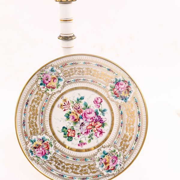 piano circolare su balaustro e base trilobata, decorato in vivace policromia da fitta composizione floreale