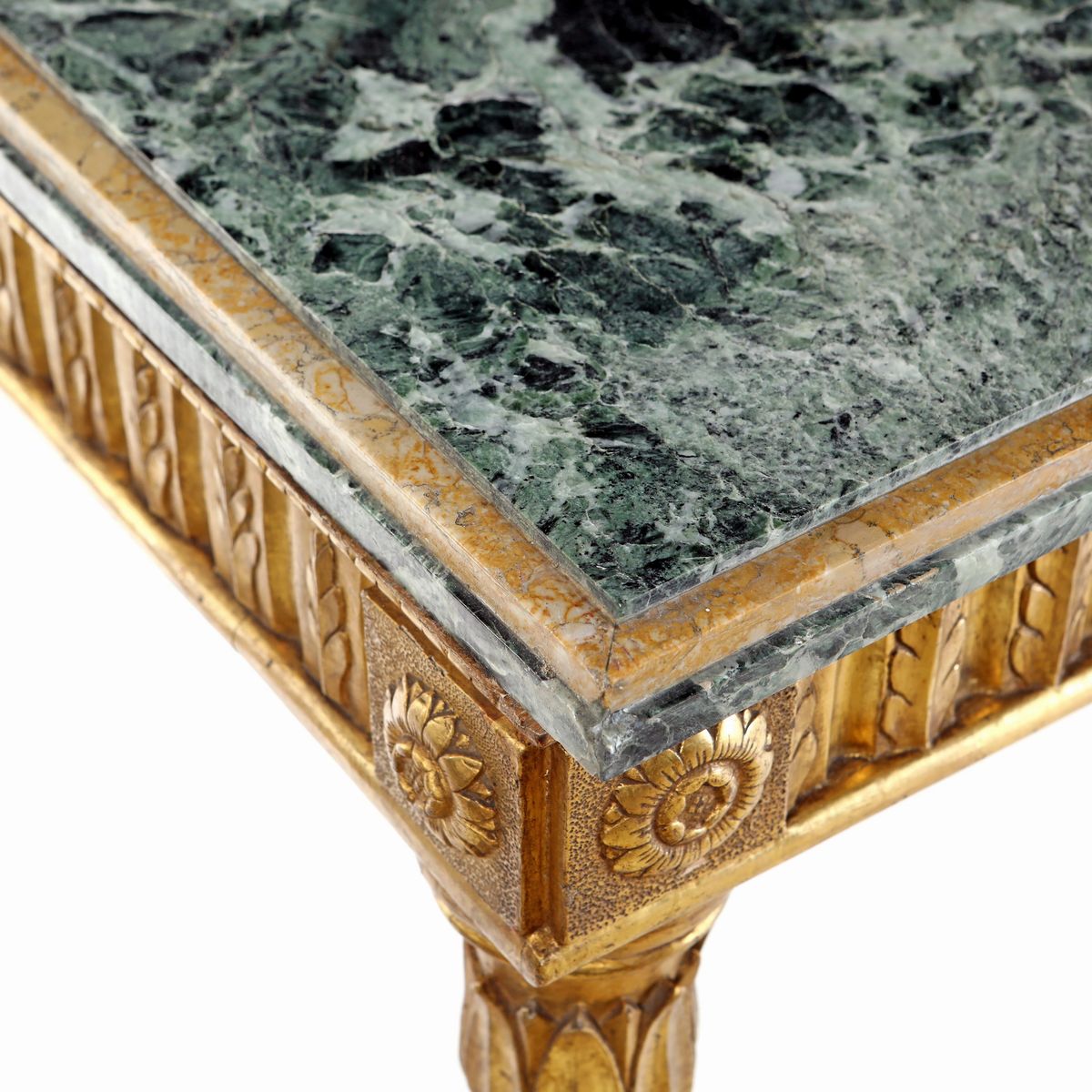 fascia interamente percorsa da scanalature alternate a foglie lanceolate, interrotte da una formella centrale con trofeo d'armi in bassorilievo e da dadi angolari con corolle; gambe rastremate scanalate con estremità calzate in un cespo fogliaceo. Piano rettangolare in marmo verde antico con ciglio squadrato in marmo giallo