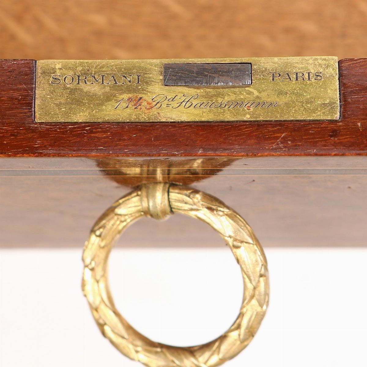 con piano rettangolare sormontato da specchiera a bilico di forma ovale affiancata da braccetti reggicandela in bronzo dorato; un cassetto nella fascia, gambe rastremate. Reca iscritto "Sormani" sulla cerniera del cassetto