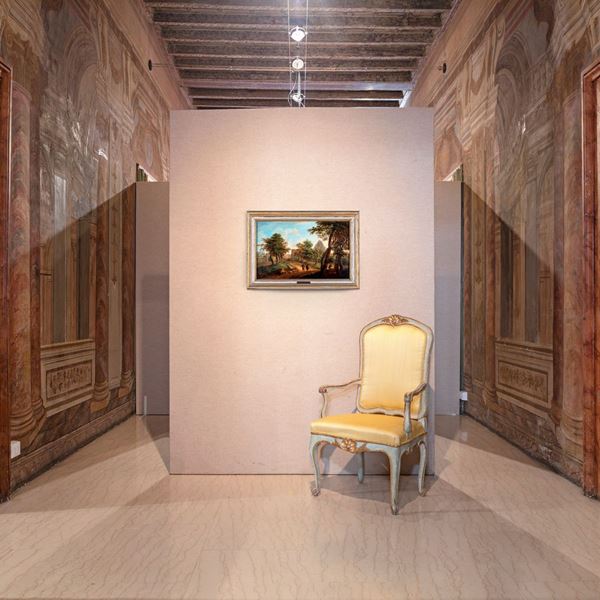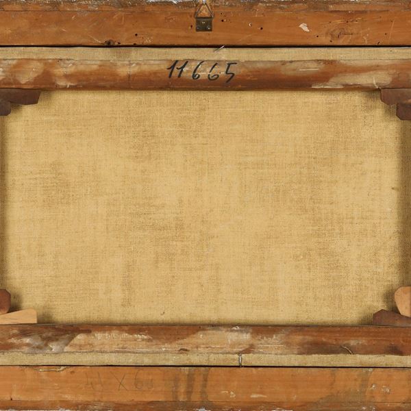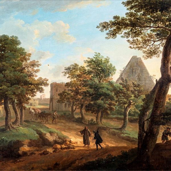 Sullo sfondo di un bel paesaggio arcadico fa capolino la silhouette della Piramide Cestia, monumento che da sempre ha affascinato i pittori che frequentavano la campagna romana. Fascino che subì indubbiamente Paolo Anesi, artista a che amò particolarmente dipingere, molto spesso per i gradturisti inglese che affollavano l'Urbe, dei delicati paesaggi, nei quali grazie alle velature e a una stesura morbide del colore, si riusciva a respirare l'essenza della campagna.