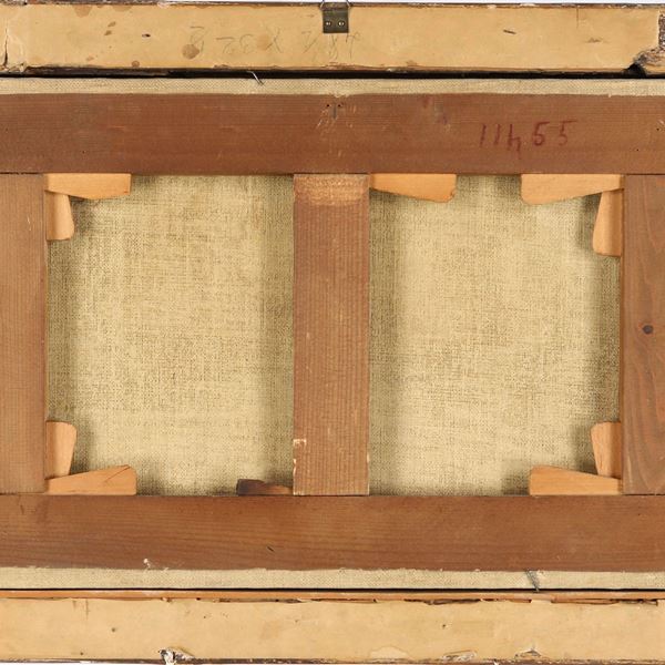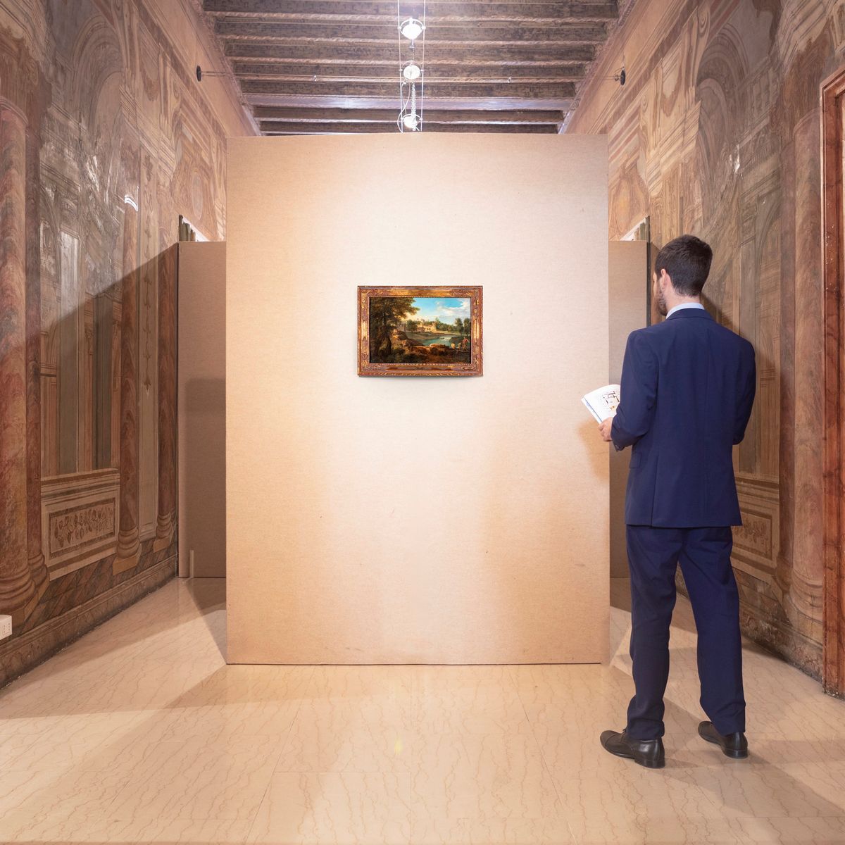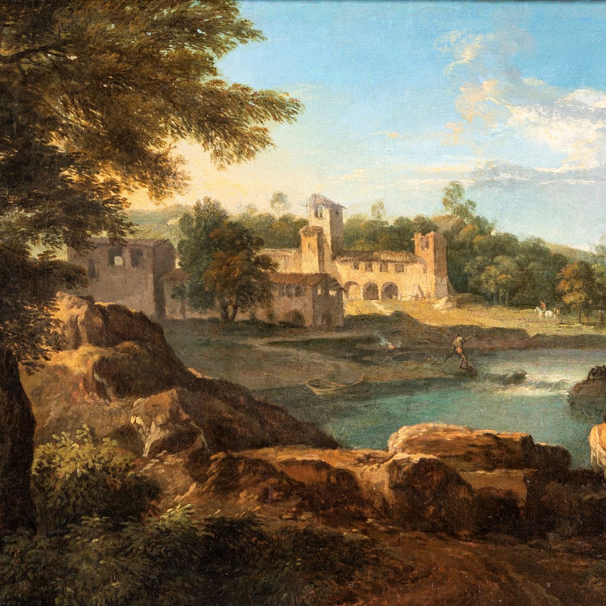 Questa bella tela, tipico esempio del paesaggio arcadico romano di pieno settecento, è ascrivibile alla mano del talentuoso Paolo Anesi. Figura cardine del XVIII secolo, che seppe coniugare nelle sue vedute il gusto della tradizione classicheggiante da Claude Lorrain fino a Jan Frans Van Bloemen, con il bizzarro stile dei pittori bamboccianti. Nel nostro dipinto la quinta architettonica degli alberi sulla sinistra apre ad un placido fiume che scorre nei pressi di un villaggio, mentre tre personaggi siedono su di un muretto. L'intera scena è illuminata dalla luce proveniente dal cielo terso, che preannuncia ad un tramonto.