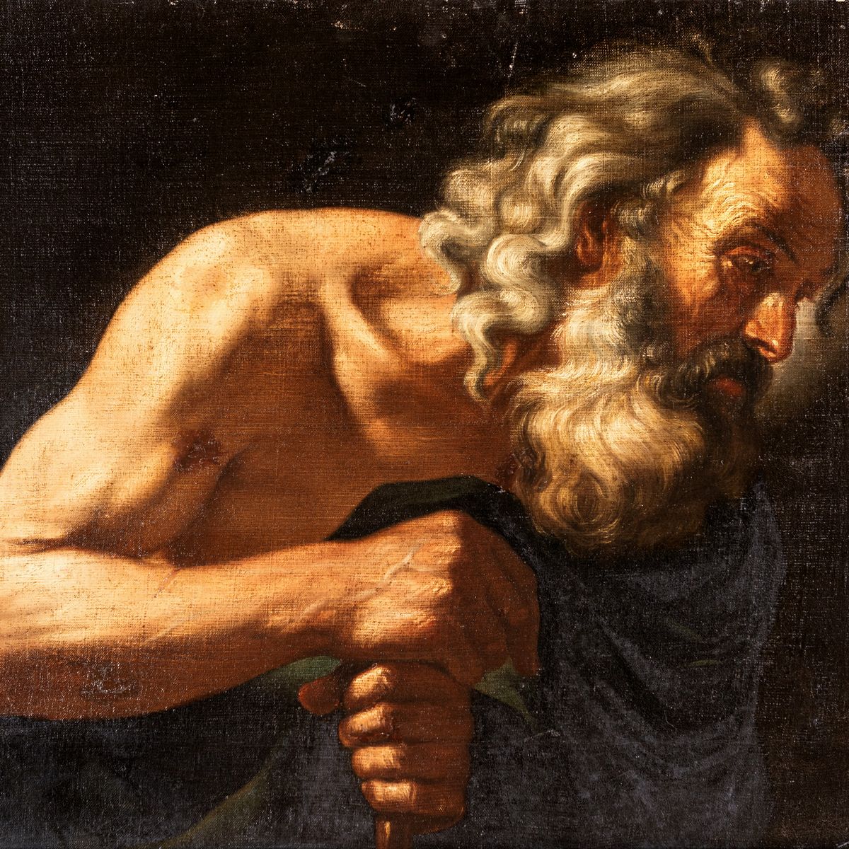 Un fascio di luce illumina il potente braccio, la fronte raggrinzita e i capelli di questo solitario San Tommaso, che con uno sguardo indagatore, dobbiamo pensare, stia osservando la ferità sul costato di Gesù. L’assenza proprio della figura di Cristo sembra poter essere plausibile la possibilità che la nostra tela sia uno studio avanzato di una composizione ben più ampia. I colori così terrosi, la sfondo completamente scuro, da cui risalta la figura del santo, i dettagli anatomici così ben resi dimostrano che il nostro pittore aveva studiato approfonditamente la pittura caravaggesca a Roma durante il XVII secolo. Per questi motivi e per la vicinanza stilistica con alcune tele, come ad esempio Loth e le figlie, dove la figura di Loth è quasi speculare al nostro santo, ci inducono ad avvicinare la tela alla bottega di Giacinto Brandi.