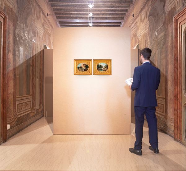 Le nostre due tele, tuttavia, afferiscono a un secondo filone produttivo, forse più interessante ed intimistico, che Crepin coltivò per tutta la vita: la pittura di paesaggio di stampo arcadico-romana, imparata dal suo altro grande maestro spirituale, Hubert Robert. I due ovali rappresentano una placida campagna, dove scorre un fiume animato da pastorelli intenti ad osservarlo. A fare da quinta architettonica ci sono degli imponenti alberi che si stagliano su dei cieli tersi e sembrano incombere sulle figure, quasi presagendo un gusto romantico verso il dato naturalistico. I riferimenti, oltre al già citato Hubert Robert, non possono che ritrovarsi nella grande tradizione seicentesca di Claude Lorrain, Nicolas Poussin e Gaspar Dughet, senza dimenticare l’influsso en plein air del coevo Pierre Henri de Valenciennes.