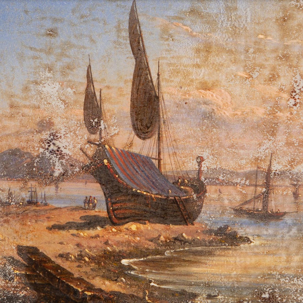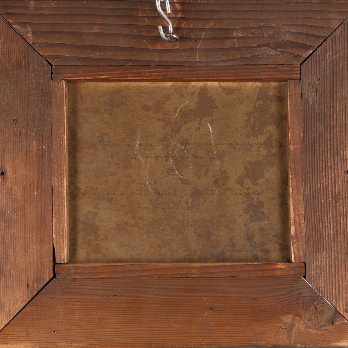 Iscrizione al retro: "Barca da pesca, detta "Poranzello" della Marina del Carmine a Napoli [...] O dipinto ad olio sulla seta e fissato al cristallo con composizione". Firmato "Andrea de Crescenzo", con data e luogo "Napoli 1874"