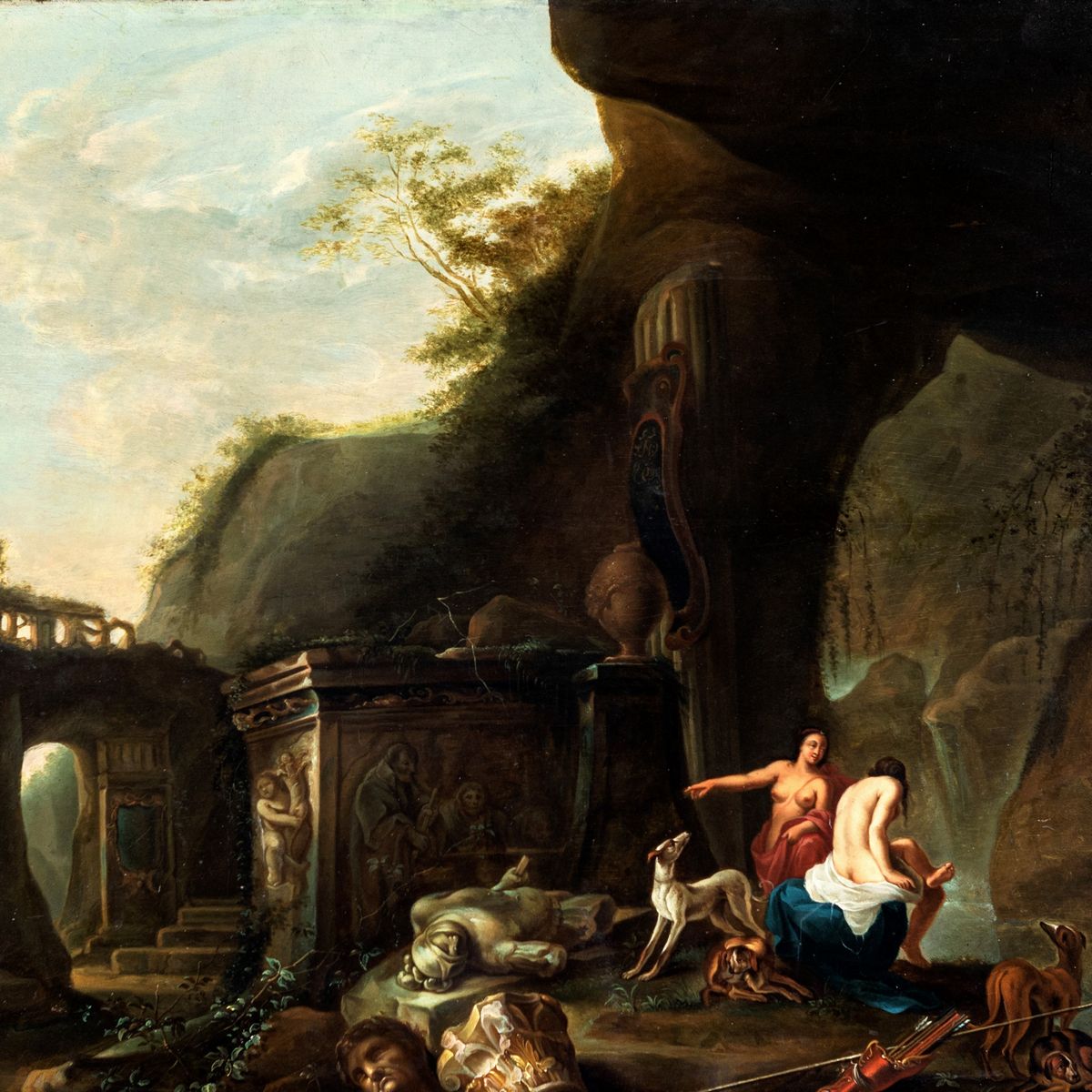 Il paesaggio si caratterizza per un pennellata fluida e sciolta che delinea le ninfe che giocano nell'acqua e si riposano dopo aver cacciato con la dea Diana e i cani. Di estremo interesse sono le varie statue, bassorilievi e obelischi di ascendenza classica presenti nel paesaggio, in particolare in primo piano troviamo una scultura di un giovane morente da identificare con Adone. Gli elementi stilistici, il tratto liquido e la chiarezza dei colori ci inducono a pensare ad un pittore francese attivo a Roma alla fine del XVIII secolo.