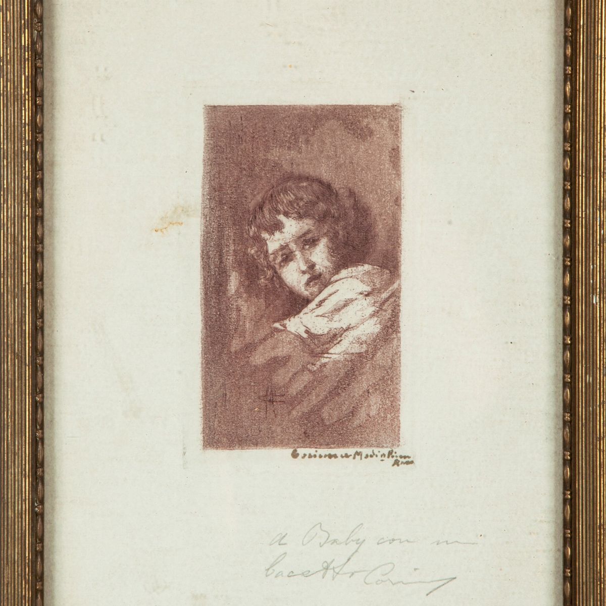 Monogramma in lastra. Firma in basso a destra "Corinna Modigliani Roma", con dedica a matita "a Baby con un bacetto Corinna Roma 8 maggio 1917". Provenienza: eredi Ettore Modigliani, Milano.