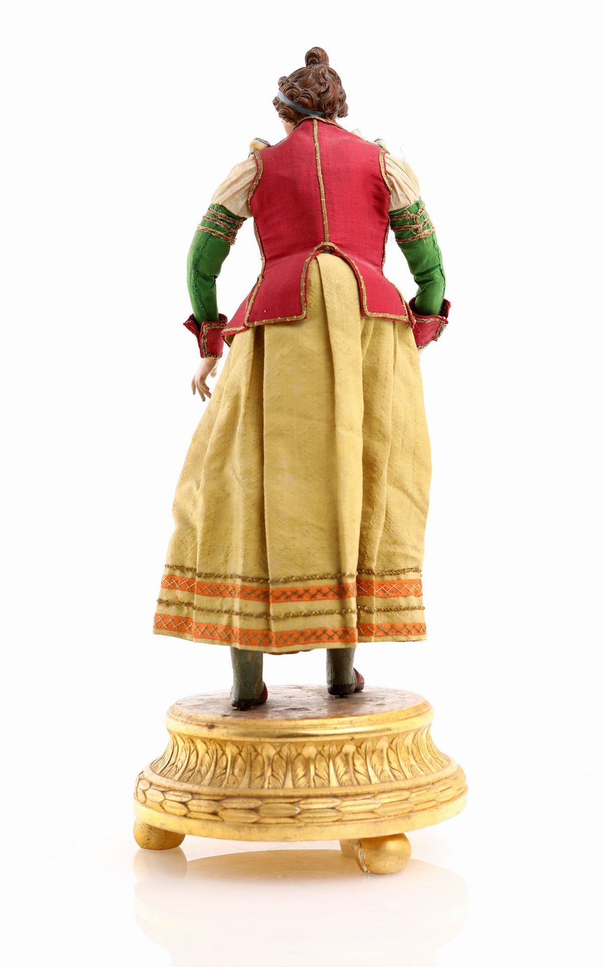 camicia plissettata bianca, maniche verdi con polsi rossi così come il gilet rifinito da ricami dorati; corsetto marrone, gonna gialla, sinale a righe con gallonature, scarpe rosse. Stante su piedistallo circolare in legno dorato con fascia intagliata a palmette, piedi a sfera