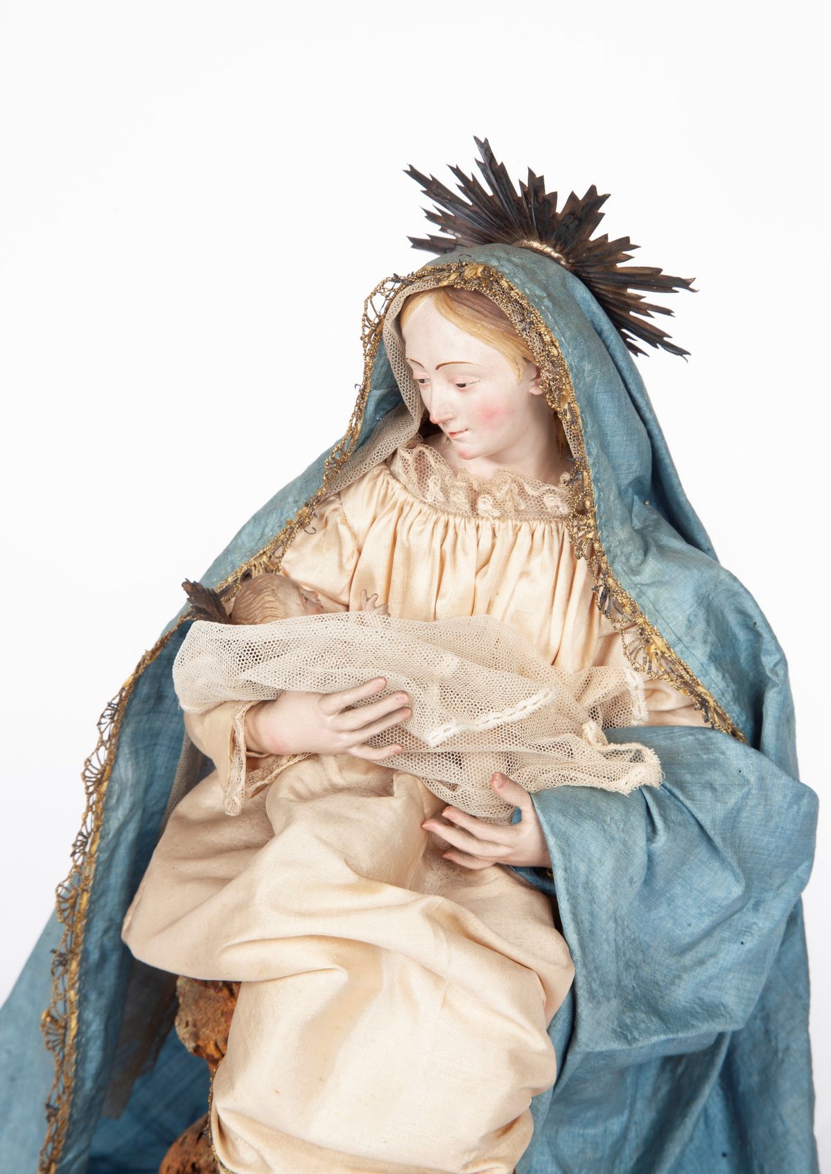 Maria ritratta seduta e abbigliata con tunica rosa, ampio mantello azzurro, sandali ai piedi. Bambino Gesù in legno avvolto in merletto. Accessori: aureole in argento; supporto in sughero