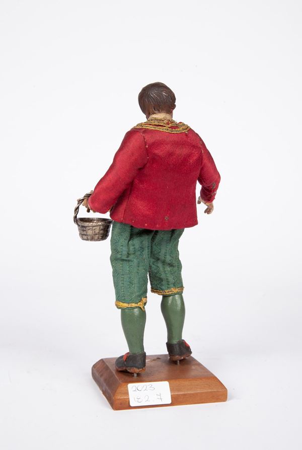 testa lievemente rivolta verso la spalla destra e bocca socchiusa; gilet e giacca rossa con gallonatura, pantaloni di tela azzurra. Accessori: cesta in metallo