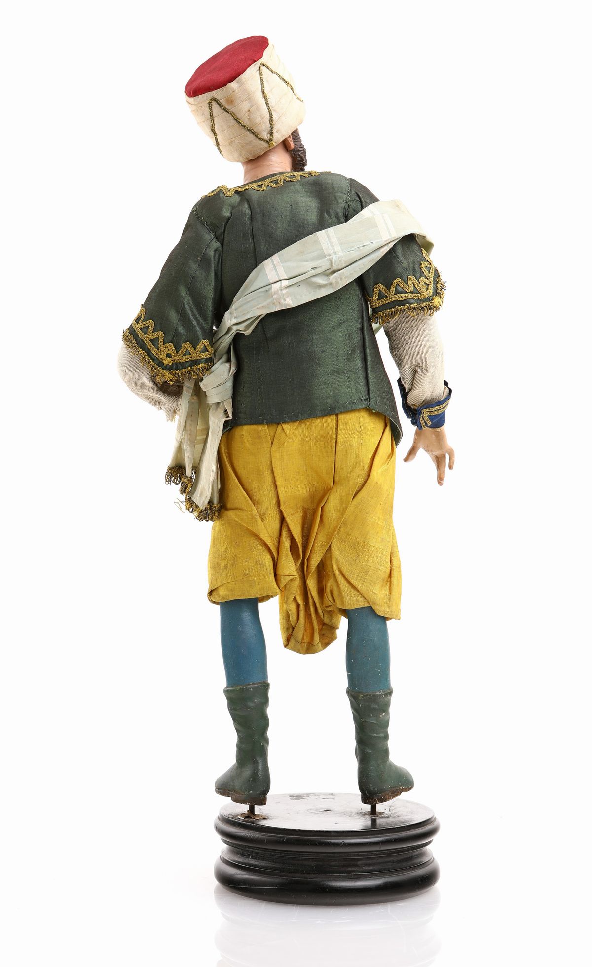 folta barba e codino, panciotto avorio con alamari dorati, giacca verde con alamari dorati da cui escono le maniche; ampia fusciacca di seta a tracolla; pantaloni di seta gialla trattenuti da fusciacca rossa e stivali verdi ai piedi