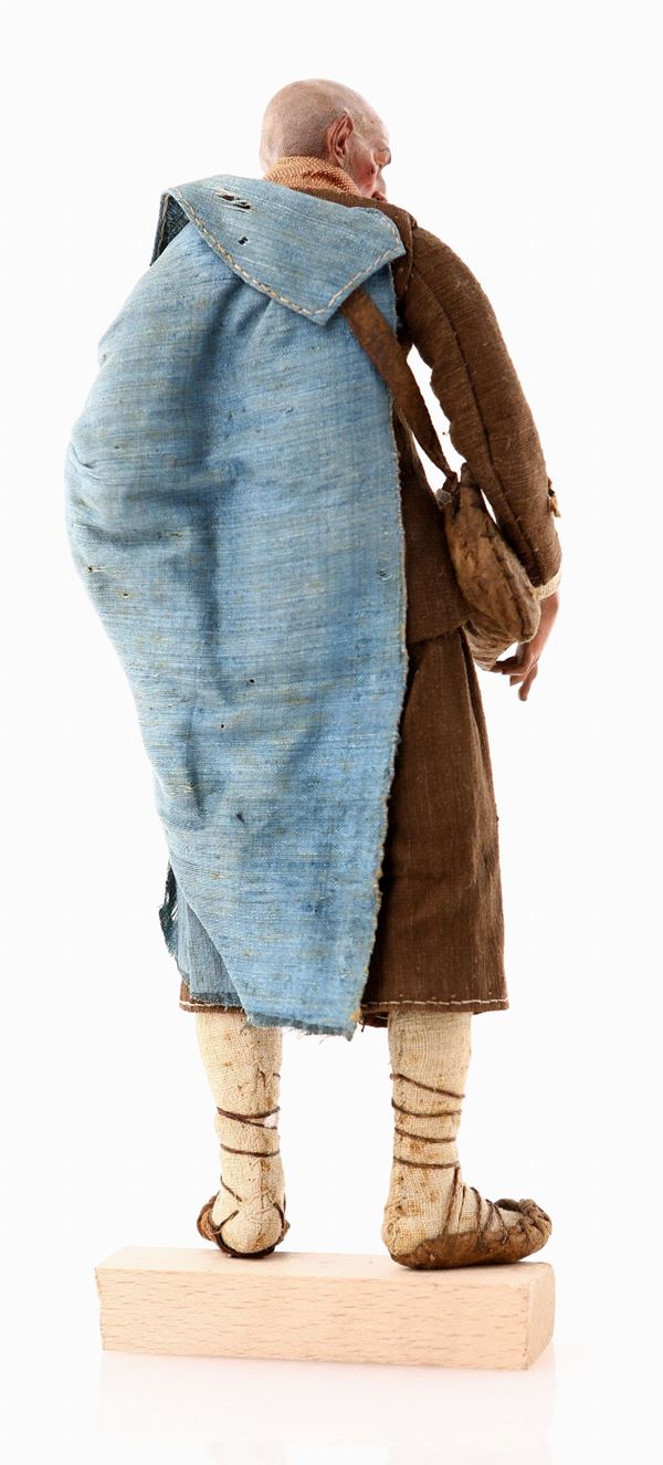 giacca e pantaloni marroni, mantello azzurro posato sulla spalla sinistra, ciocie ai piedi. Accessori: bisaccia