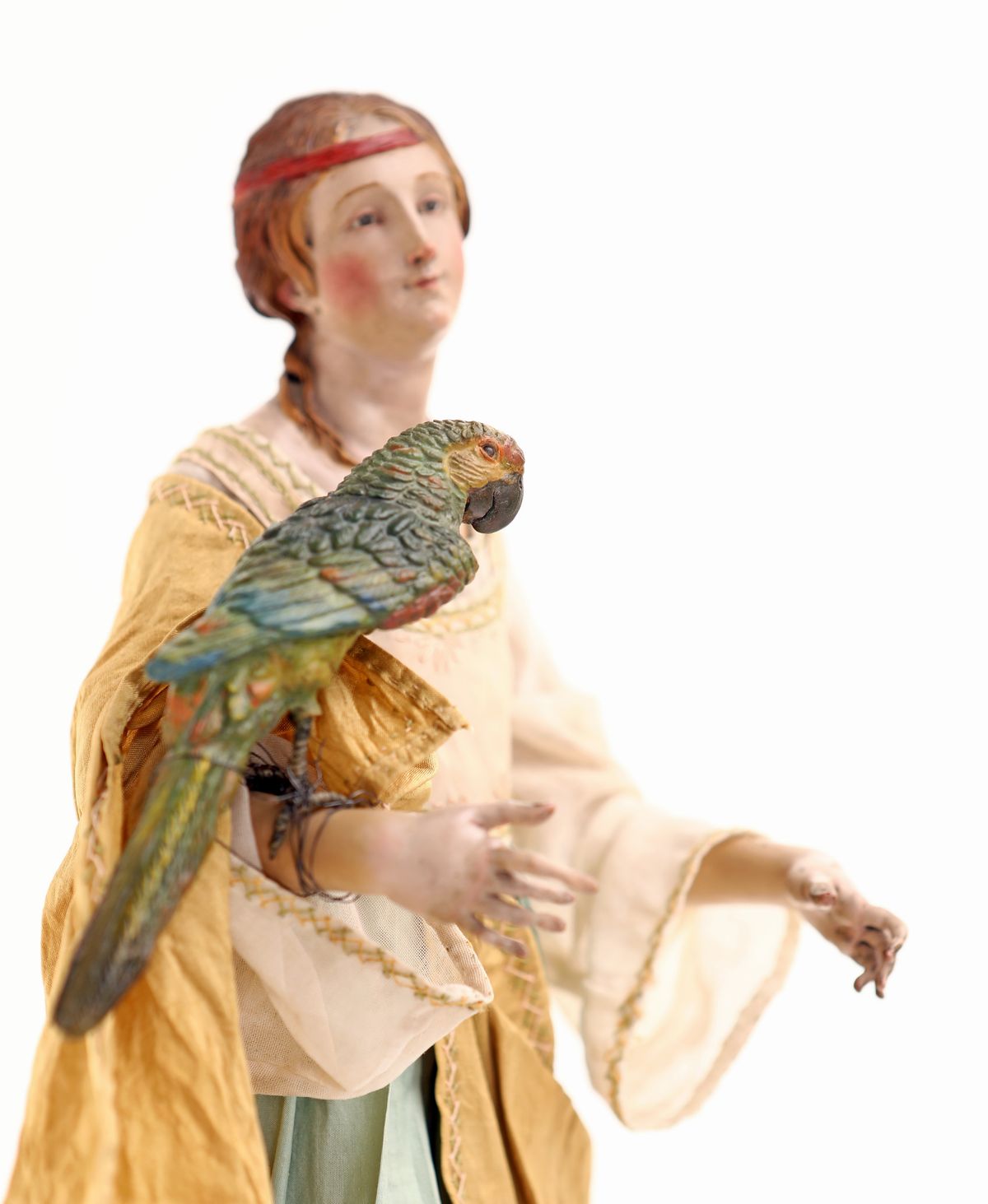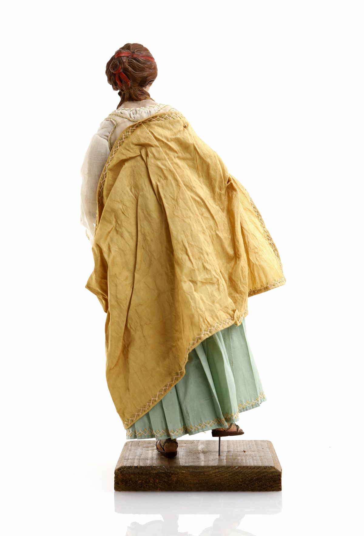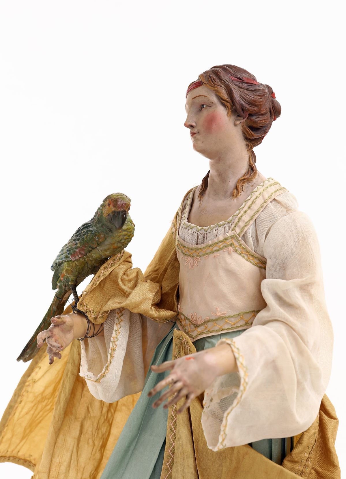 ricca capigliatura con nastro rosso secondo la moda dell'epoca, camicia plissettata in seta avorio, corpetto beige, ampia gonna azzurra a pieghe, mantello giallo, sandali ai piedi. Accessori: pappagallo in terracotta policroma con occhi di vetro
