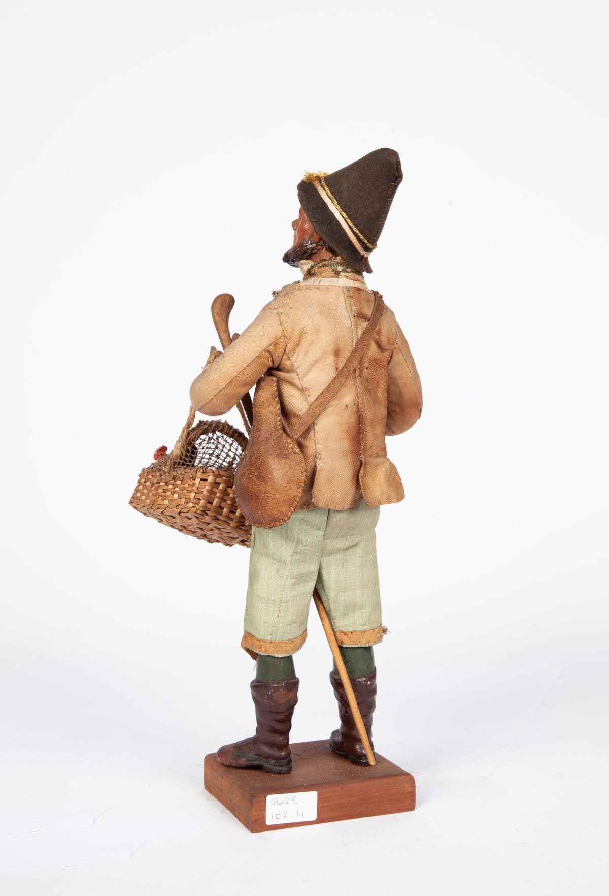 camicia bianca, panciotto marrone e giacca beige; pantaloni di tela, stivali. Accessori: cappello, bastone, bisaccia e cesta con polli