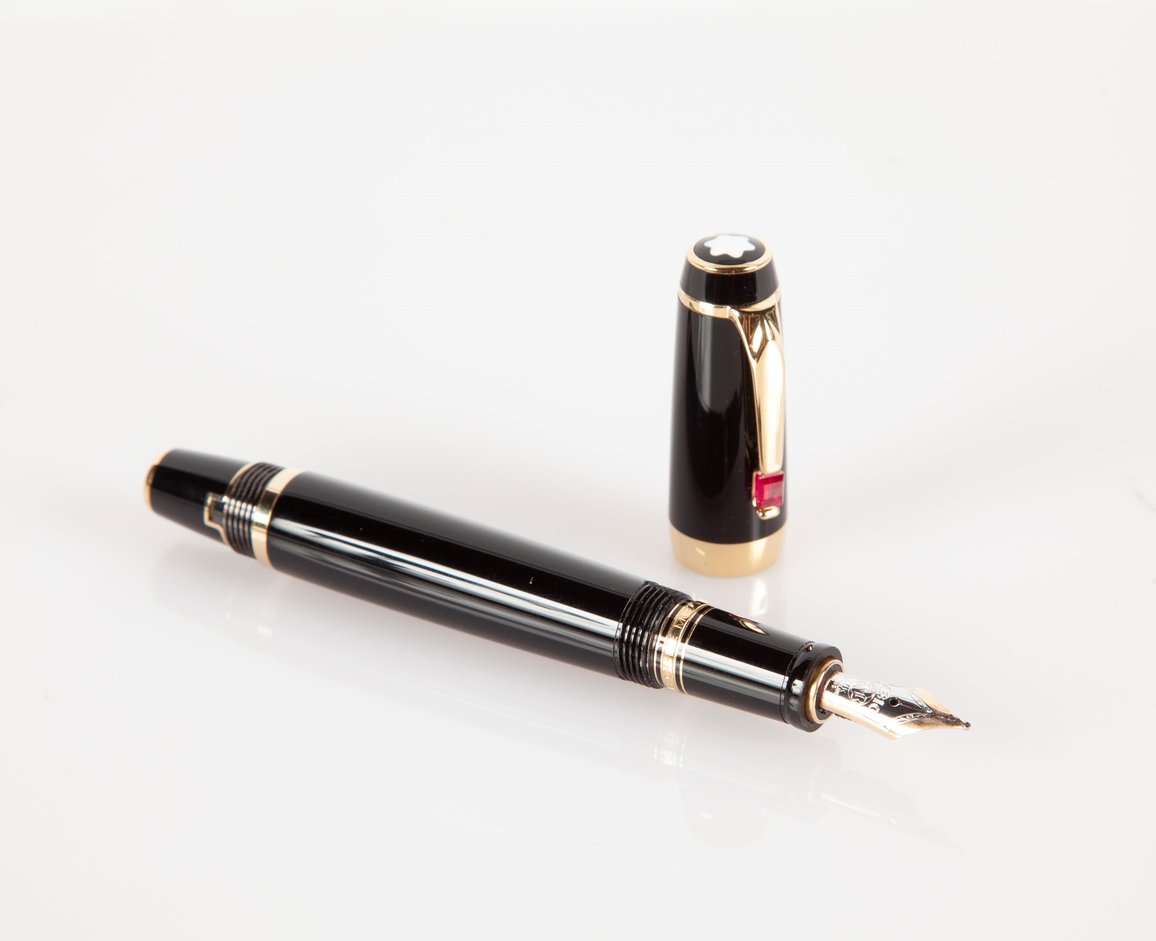 Montblanc Boheme rouge - Penna stilografica con pennino retrattile in vernice nera e finiture laminate in oro giallo, con gemma rossa sulla clip, 2006