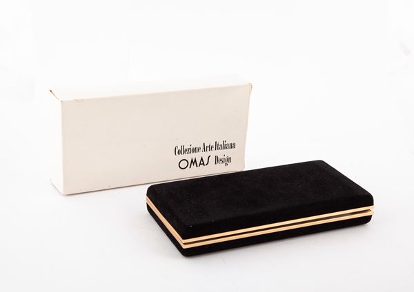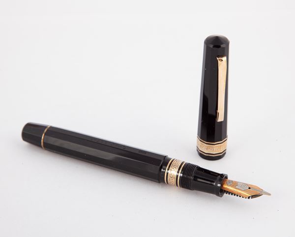 Omas 557 F - Penna stilografica a pistone in celluloide nera con particolari in metallo placcato in oro giallo