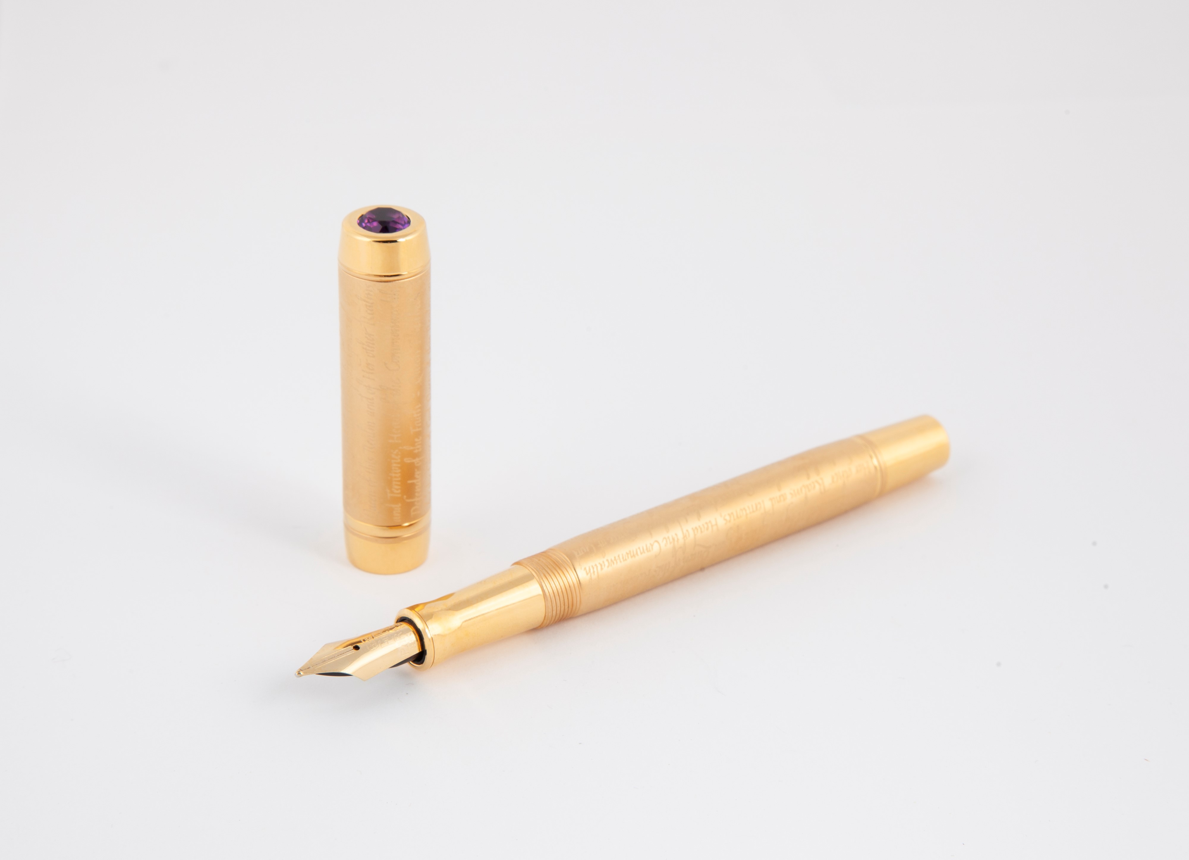 Pennino M in oro giallo 18kt con inciso monogramma della Regina Elisabetta; ametista ct. 1,50 sul cappuccio, iscrizioni sul fusto. Edizione limitata di 2500 esemplari ns. 1318. Entro astuccio con istruzioni, garanzia, scatola, confezione da cinque cartucce originali.