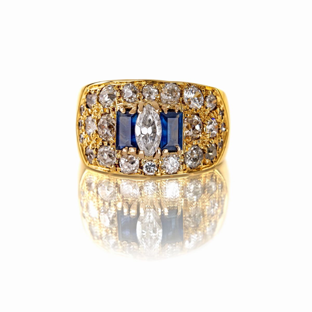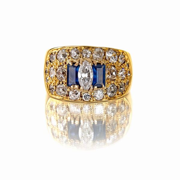Oro giallo 750/000. Diamanti in taglio rotondo brillante e navette ct. 2 ca, zaffiri. Peso complessivo gr. 9,70