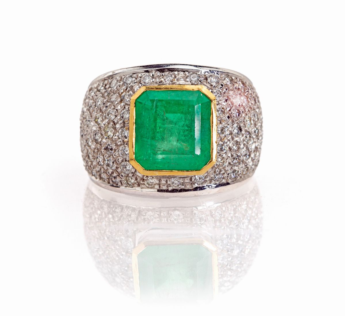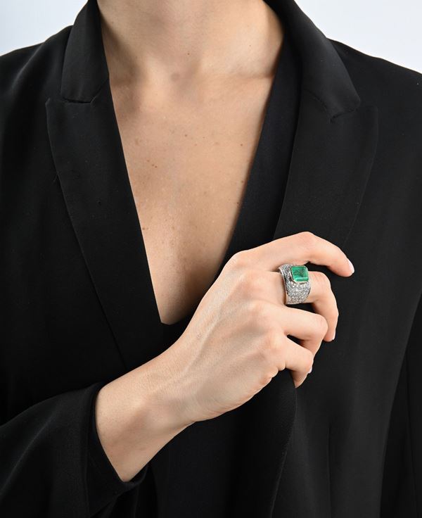 Oro bianco 750/000. Smeraldo naturale ct. 5,50 ca, diamanti in taglio rotondo brillante ct. 2,30, prob G-H, VS-SI. Peso complessivo gr. 14,60