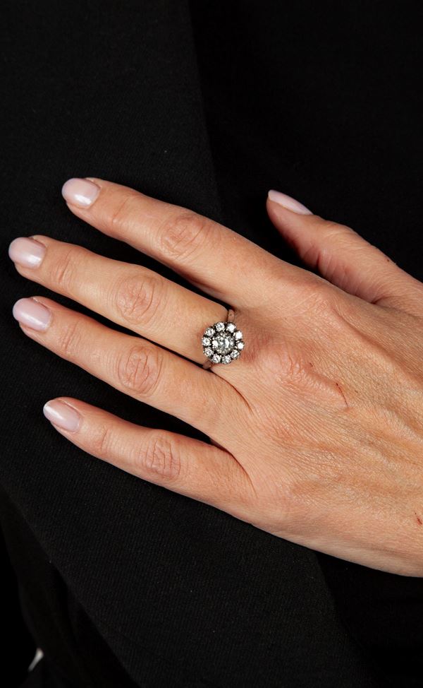 Oro bianco 750/000. Diamante in taglio rotondo brillante e contorno di brillanti ct. 1,30 ca. Peso complessivo gr. 6,60.