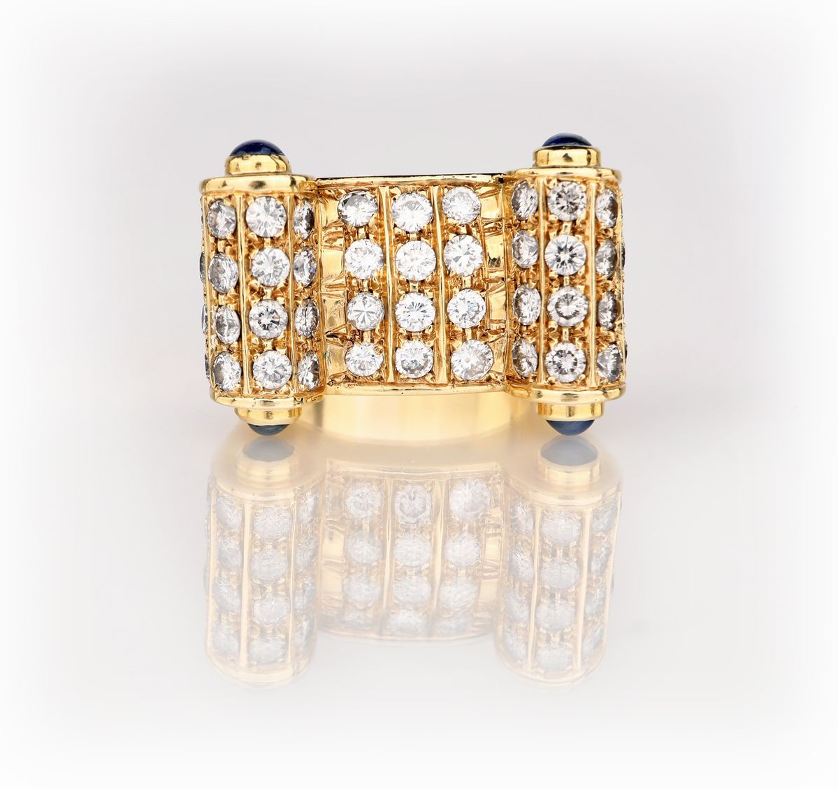 Oro giallo 750/000. Zaffiri in taglio cabochon. Diamanti taglio rotondo brillante, ct. 1,60 ca. H-I, VS-SI. Peso complessivo gr 22,30