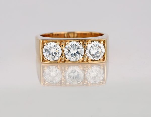 Oro giallo 750/000. Diamanti in taglio rotondo brillante ct. 1,50 ca., prob. G-H, VS-SI. Peso complessivo gr. 9,10.