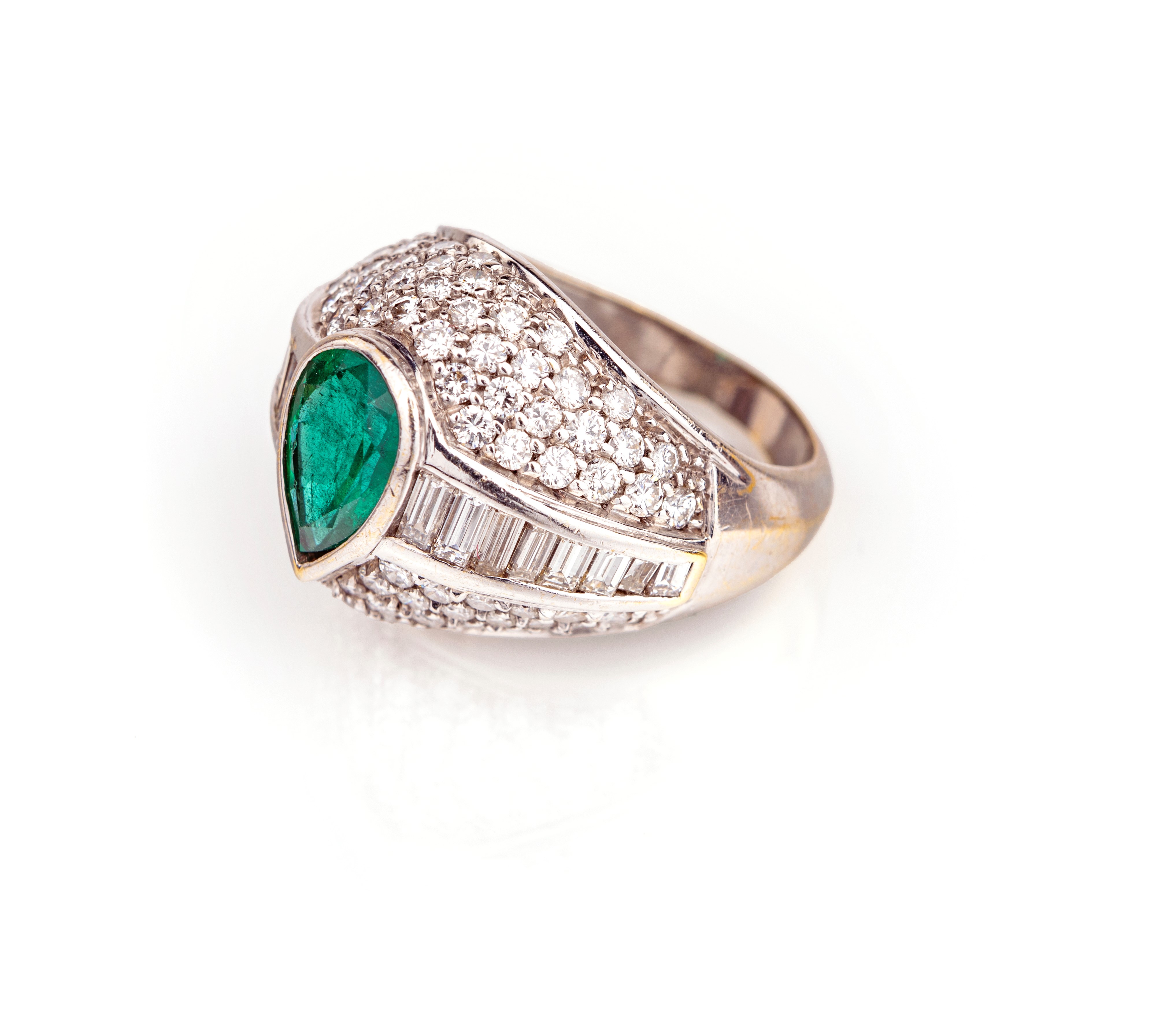 Oro bianco 750/000. Smeraldo naturale in taglio goccia ct. 2,00 ca. Diamanti in taglio rotondo brillante e taglio baguette, ct. 2.00 ca. Prob. G, VVS-VS