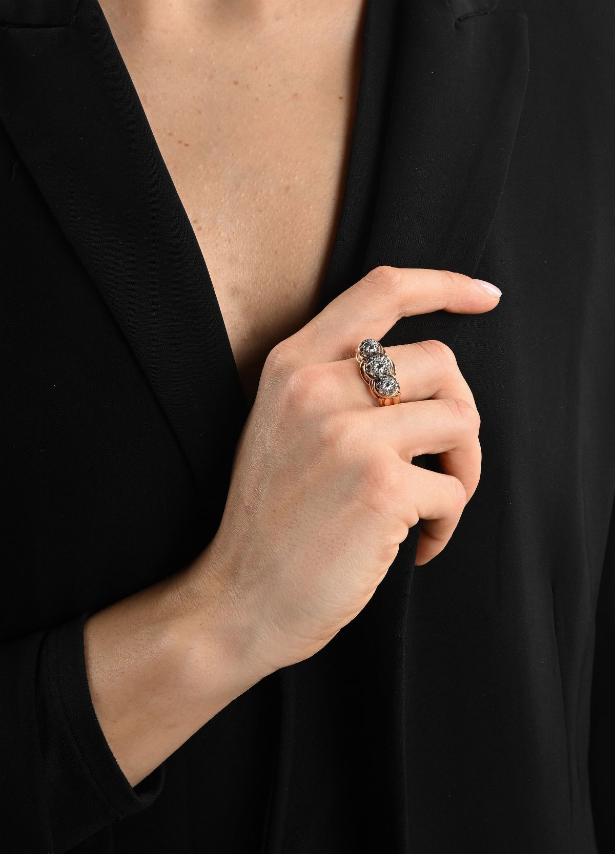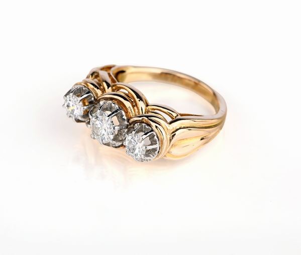 Oro rosa e bianco 750/000. Diamanti in taglio rotondo brillante ct. 0,75 ca., prob G-H, VS. Peso complessivo gr. 10,10