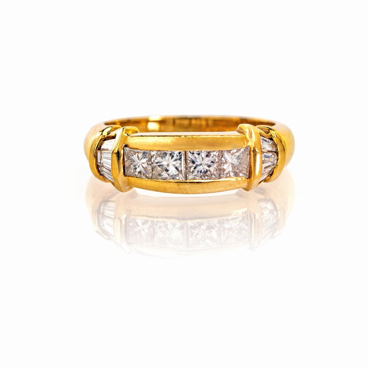Oro giallo 750/000. Diamanti in taglio princess, baguettes e teppers ct. 0,90 ca. prob G-H, VVS/VS. Peso complessivo gr. 5,10.