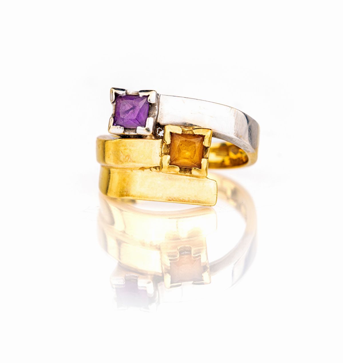 Oro giallo e bianco 750/000. Quarzo citrino e ametista in taglio carré. Peso complessivo gr. 7,10.