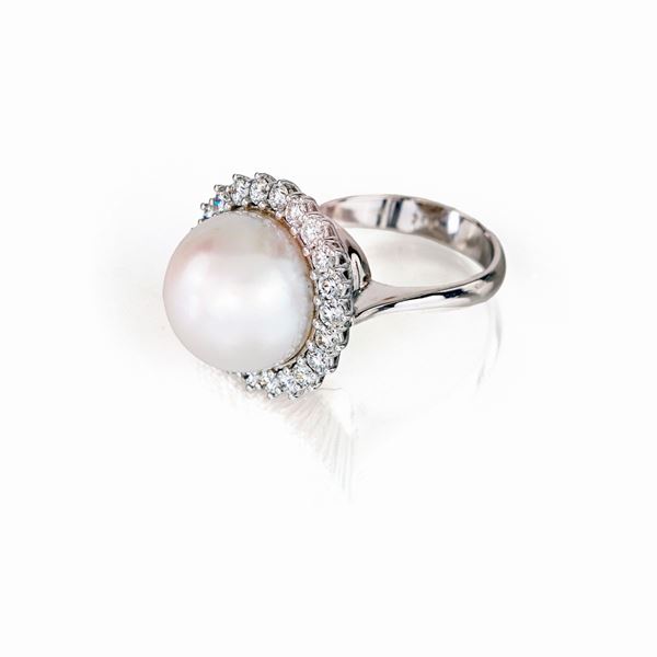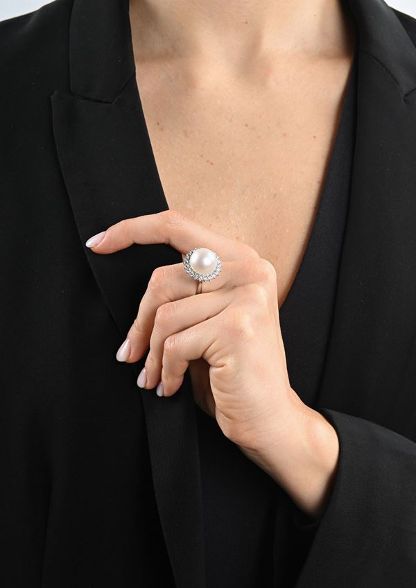 Oro bianco 750/000. Perla naturale South Sea mm. 13, diamanti in taglio rotondo brillante ct. 1,20 ca. Peso complessivo gr. 11