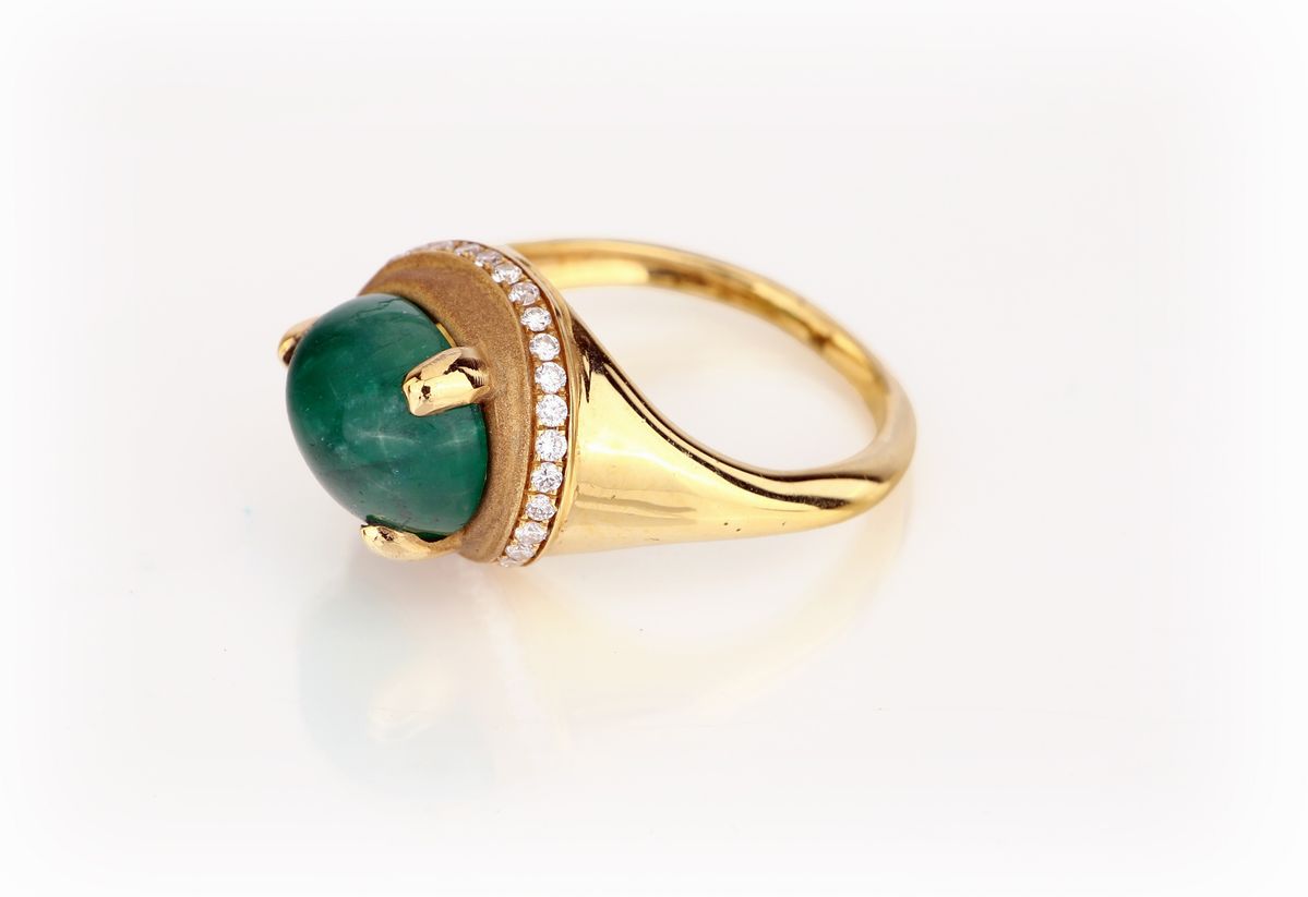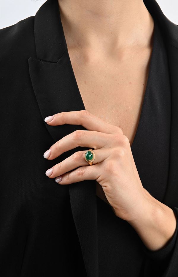 Oro giallo 750/000. Smeraldo naturale in taglio cabochon ct. 3,40 ca., diamanti in taglio rotondo brillante. Peso complessivo gr. 7,30