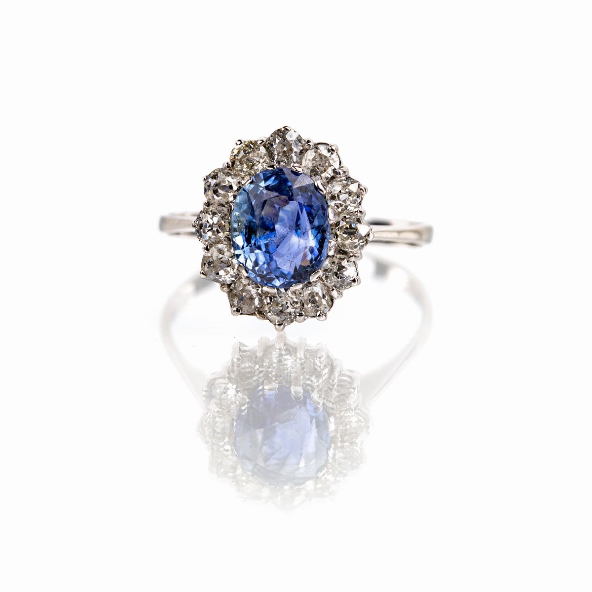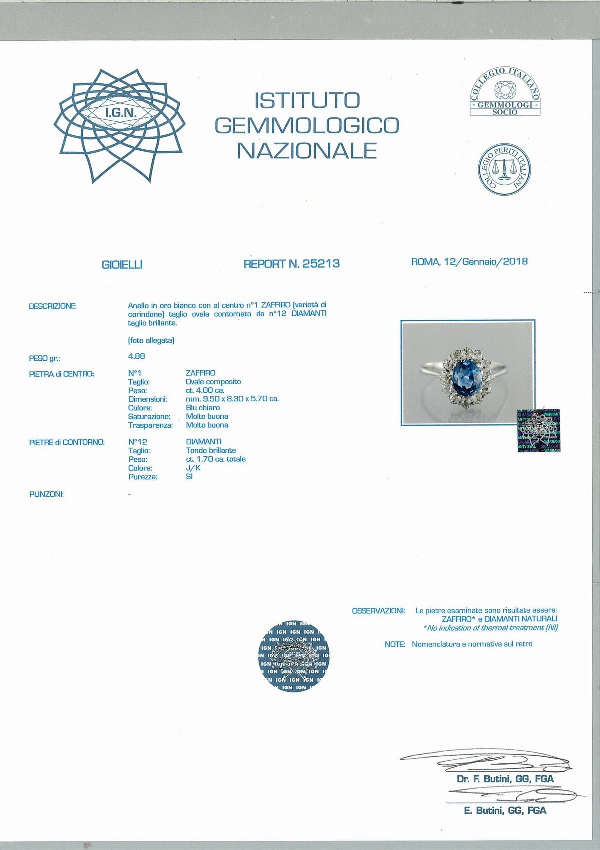 Oro bianco 750/000. Zaffiro naturale in taglio ovale ct. 4, diamanti in taglio rotondo brillante ct. 1,70, J-K, SI. Peso complessivo gr. 4,80. Corredato di certificazione gemmologica.